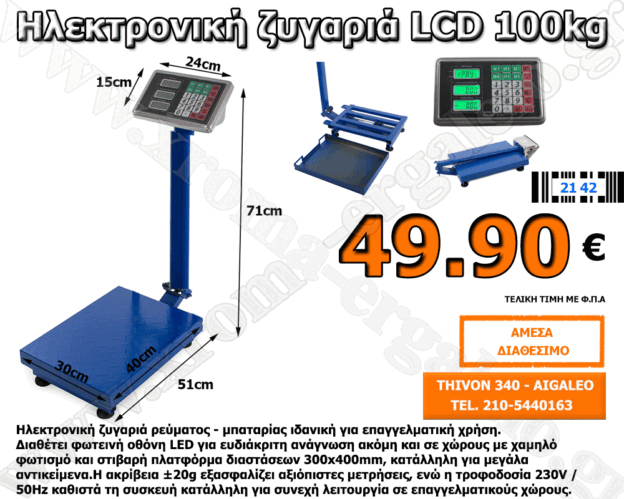 Διαθέτει φωτεινή οθόνη LED για ευδιάκριτη ανάγνωση ακόμη και σε χώρους με χαμηλό φωτισμό και στιβαρή πλατφόρμα διαστάσεων 300x400mm, κατάλληλη για μεγάλα αντικείμενα.Η ακρίβεια ±20g εξασφαλίζει αξιόπιστες μετρήσεις, ενώ η τροφοδοσία 230V / 50Hz καθιστά τη συσκευή κατάλληλη για συνεχή λειτουργία σε επαγγελματικούς χώρους.
