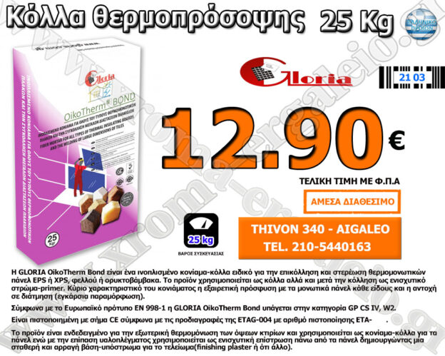 Η GLORIA OikoTherm Bond είναι ένα ινοπλισμένο κονίαμα-κόλλα ειδικό για την επικόλληση και στερέωση θερμομονωτικών πάνελ EPS ή XPS, φελλού ή ορυκτοβάμβακα. Το προϊόν χρησιμοποιείται ως κόλλα αλλά και μετά την κόλληση ως ενισχυτικό στρώμα-primer. Κύριο χαρακτηριστικό του κονιάματος η εξαιρετική πρόσφυση με τα μονωτικά πάνελ κάθε είδους και η αντοχή σε διάτμηση (εγκάρσια παραμόρφωση).
