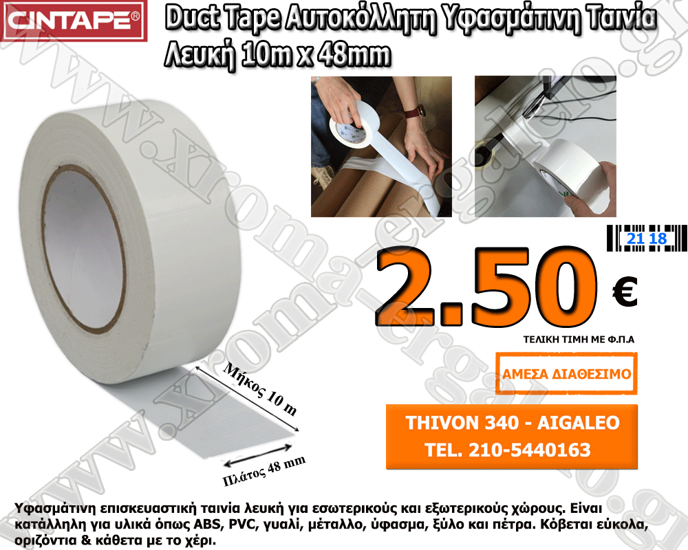duct tape αυτοκόλλητη υφασμάτινη ταινια λευκή 10m x 48mm Cintape