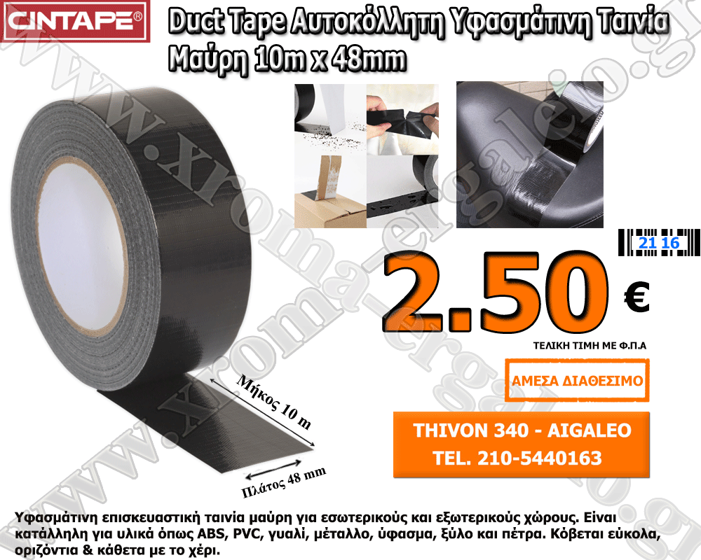 duct tape αυτοκόλλητη υφασμάτινη ταινια μαύρη 10m x 48mm Cintape