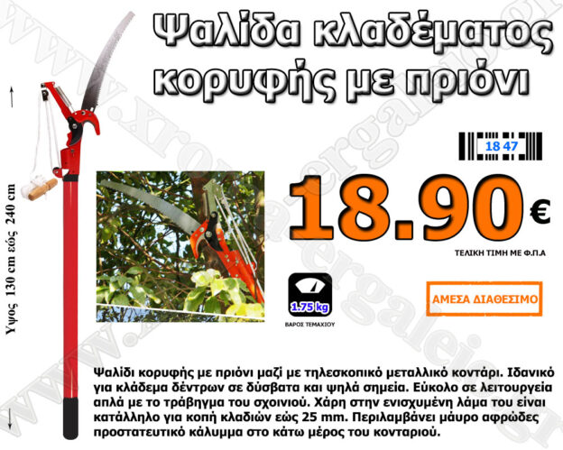 Ψαλίδι κορυφής με πριόνι μαζί με τηλεσκοπικό μεταλλικό κοντάρι.Ιδανικό για κλάδεμα δέντρων σε δύσβαατα και ψηλά σημεία,Εύκολο σε λειτουργεία απλάμε το τράβηγμα του σχοινιού.Χάρη στην ενισχυμένη λάμα του είναι κατάλληλο για κοπή κλαδιών εώς 25 mm.