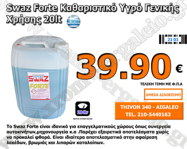 Το καθαριστικό υγρού γενικής χρήσης Swaz Forte είναι ιδανικό για επαγγελματικούς χώρους όπως συνεργεία αυτοκινήτων , μηχανουργεία κ.α. Παρέχει ήπια καθαριότητα χωρίς να προκαλεί φθορά. Είναι ιδιαίτερα αποτελεσματικό στην αφαίρεση λεκέδων, βρωμιάς και λιπαρών καταλοίπων, καθιστώντας το απαραίτητο εργαλείο για τον καθαρισμό.
