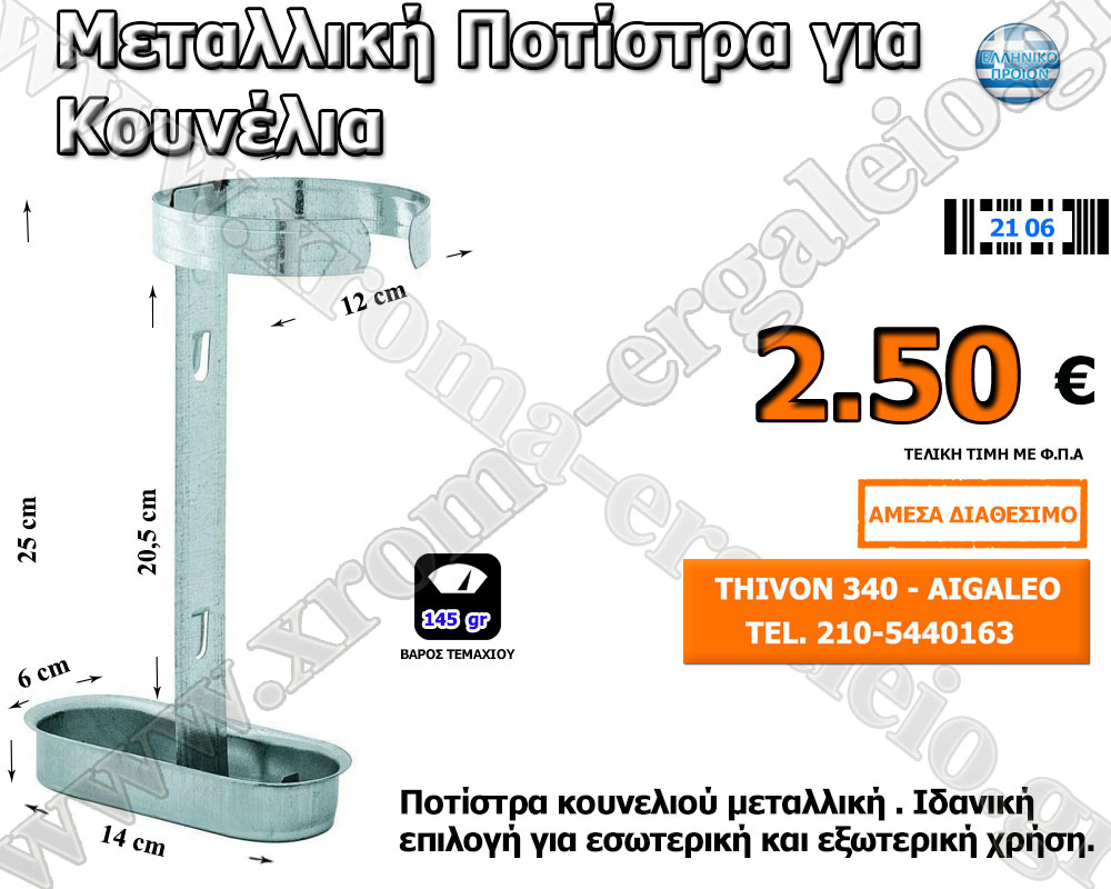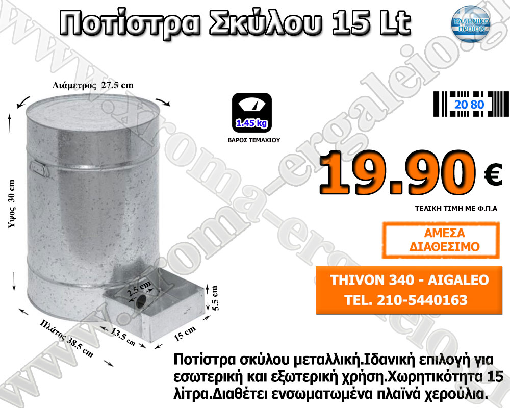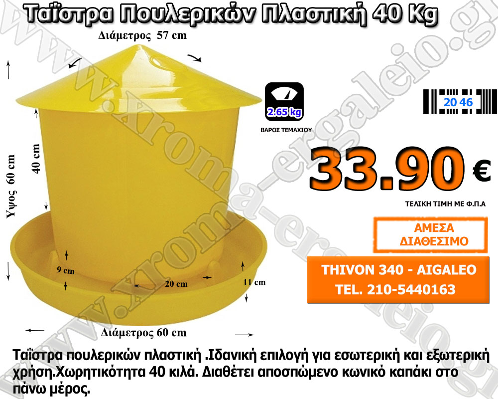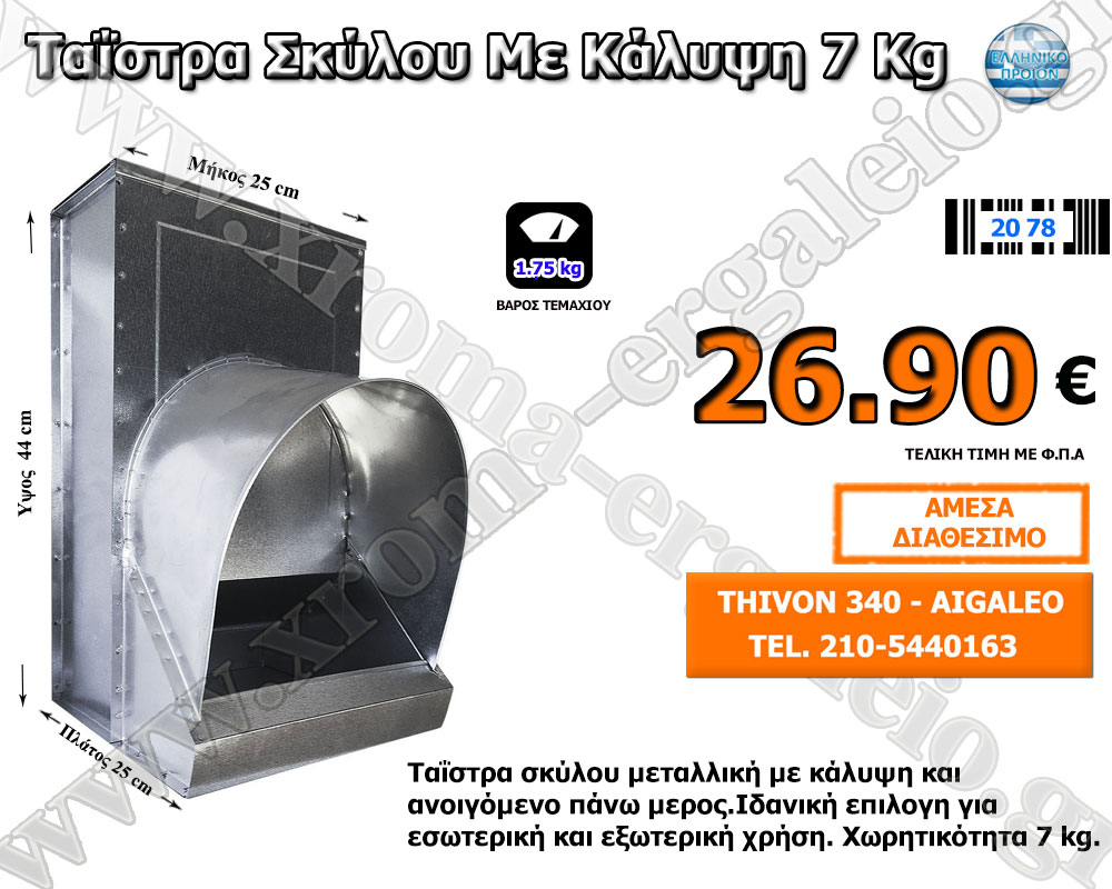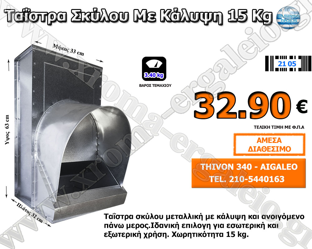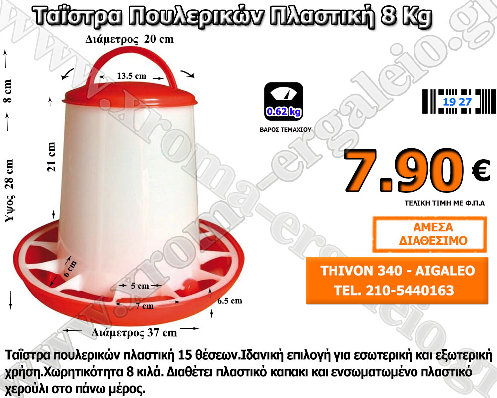 Ταΐστρες – Ποτίστρες Σκύλου & Πουλερικών από 22.90 €. Ταΐστρες – ποτίστρες σκύλου & πουλερικών μεταλλικες Ελληνικής Κατασκευής.Διαθέσιμες σε δίαφορα μεγέθη και διαστάσεις Αμεσα Διαθέσιμα. ταΐστρα πουλερικών κότας πλαστική 40 κιλά ταΐστρα πουλερικών κότας πλαστική 15 κιλά ταΐστρα πουλερικών κότας πλαστική 8 κιλά Για περισσότερες πληροφορίες καλέστε μας στο 210-5440163 Το κατάστημα μας βρίσκεται στο Αιγάλεω – Θηβών 340 δείτε το χάρτη εδώ