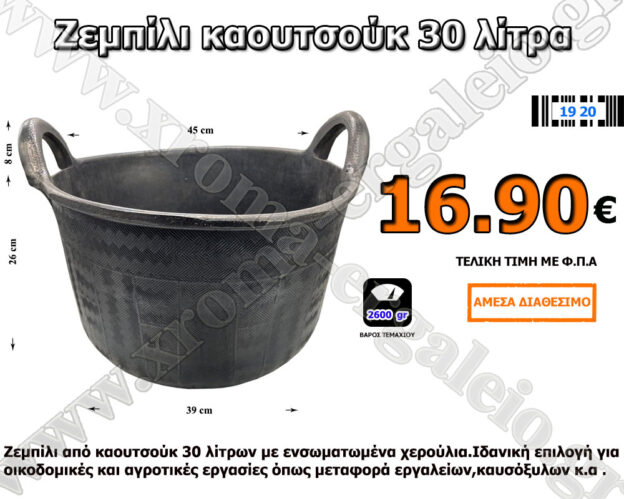 Οικοδομικό ζεμπλίλι 30 λίτρων βαρέου τύπου κατασκευασμένο από καουτσούκ.Ιδανική επιλογή για οικοδομικές και αγροτικές εργασίες.Κατάλληλο για διάφορες χρήσεις όπως μεταφορά εργαλείων ,καυσόξυλων κ.α .