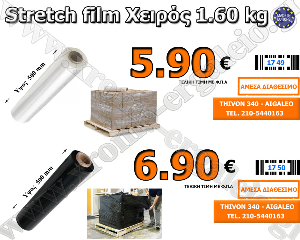 Μεμβράνη συσκευασίας Stretch film Διάφανο ή Μαύρο χειρός σε ρολό πλάτους 50cm κατασκευασμένη από πολυαιθυλένιο.Έχει εξαιρετική πρόσφυση, επιμήκυνση και υψηλή αντοχή και είναι ιδανική για στερέωση παλετών, την συσκευασία αντικειμένων και εμπορευμάτων και την προστασία τους από ζημιές, υγρασία και σκόνη στην περίπτωση μεταφοράς ή μακροχρόνιας αποθήκευσης.Το stretch film προσαρμόζεται τέλεια σε όλα τα υλικά, […]