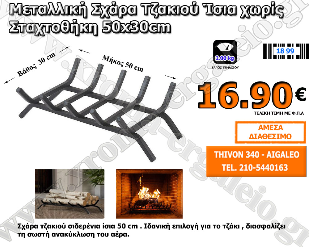 Σχάρες τζακιού κατασκευασμένες από μέταλλο.Αποτελεί απαραίτητο αξεσουάρ και διασφαλίζει τη σωστή ανακύκλωση του αέρα.Διαθέσιμες με ή χωρίς ταψί Για περισσότερες πληροφορίες καλέστε μας στο 210-5440163 Το κατάστημα μας βρίσκεται στο Αιγάλεω – Θηβών 340 δείτε το χάρτη εδώ
