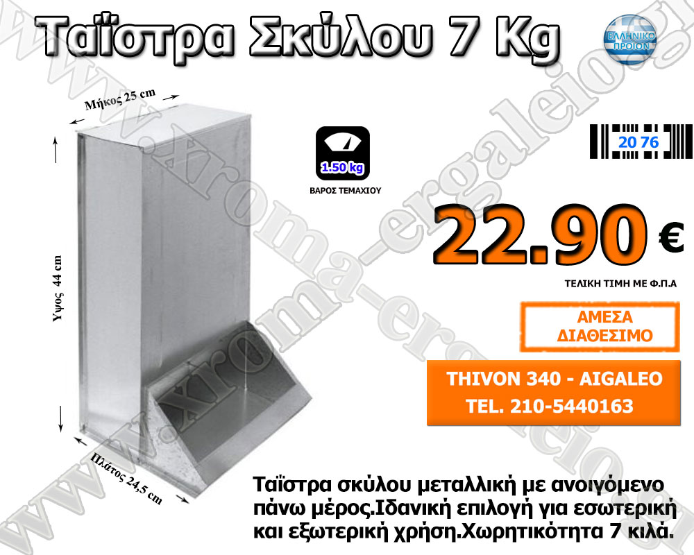 Ταΐστρες – ποτίστρες σκύλου & πουλερικών μεταλλικες Ελληνικής Κατασκευής.Διαθέσιμες σε δίαφορα μεγέθη και διαστάσεις Αμεσα Διαθέσιμα. ταΐστρα πουλερικών κότας πλαστική 40 κιλά ταΐστρα πουλερικών κότας πλαστική 15 κιλά ταΐστρα πουλερικών κότας πλαστική 8 κιλά Για περισσότερες πληροφορίες καλέστε μας στο 210-5440163 Το κατάστημα μας βρίσκεται στο Αιγάλεω – Θηβών 340 δείτε το χάρτη εδώ