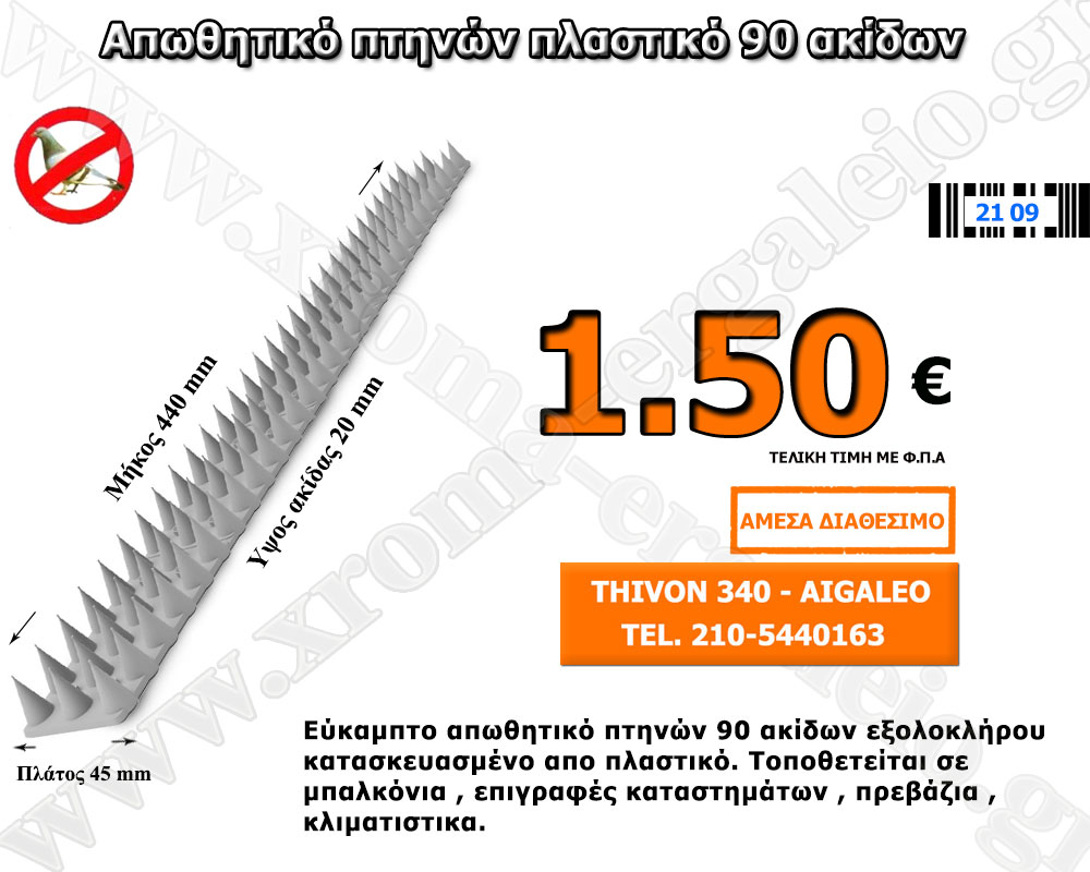 Απωθητικό Πτηνών INOX μήκους 100 cm. Είναι εξαιρετικής ποιότητας προϊόν με ακίδες ύψους 11 cm έκαστος αλλά και εύκαμπτη βάση. Όλο το προϊόν είναι ανοξείδωτο. Χρησιμοποιειτε σε σημεία που γίνονται ενοχλητικά τα πτηνά όπως μπαλκόνια , ταμπέλες καταστημάτων , πρεβάζια ακόμα και σε διάφορους στύλους . Είναι άμεσα διαθέσιμο σε μήκος 100 εκατοστών .Μπορούμε να ενώσουμε […]