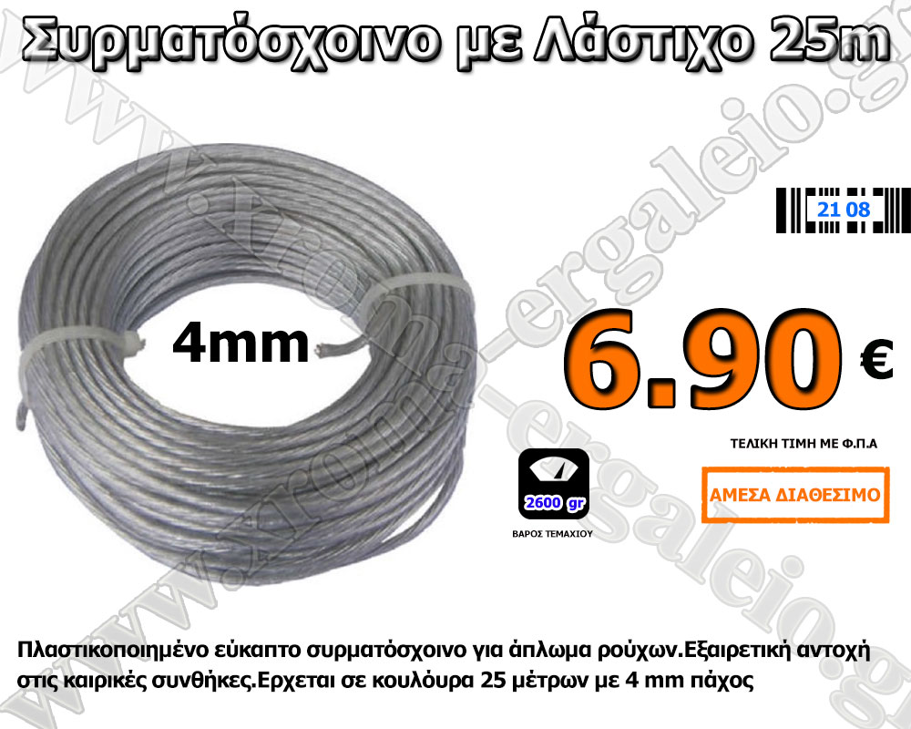 Συρματόσχοινο Με Πλαστική Επένδυση 4mm x 25m .Εξαιρετική αντοχή στισ καιρικές συνθήκες.Ευκαπτο δουλευεται εύκολα . κατάλληλο για εσωτερική και εξωτερική χρήση. Για περισσότερες πληροφορίες καλέστε μας στο 210-5440163 Το κατάστημα μας βρίσκεται στο Αιγάλεω – Θηβών 340 δείτε το χάρτη εδώ