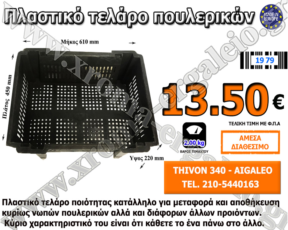 Πλαστικά τελάρα ποιότητας κατάλληλα για μεταφορά και αποθήκευση αγροτικών αλλά και διάφορων προιόντων.Τα πλαστικά τελάρα με κωδικό 1711 & 1712 έχουν διάτρητη επιφάνεια στο κάτω μέρος και προορίζονται για περισυλλογή κυρίως ελιάς .Το πλαστικό τελάρο με κωδικό 1713 έχει κλειστή επιφάνεια στο κάτω μέρος και προορίσεται για περισυλογή κυρίως για σταφύλια .Το 1934 είναι ιδανική […]