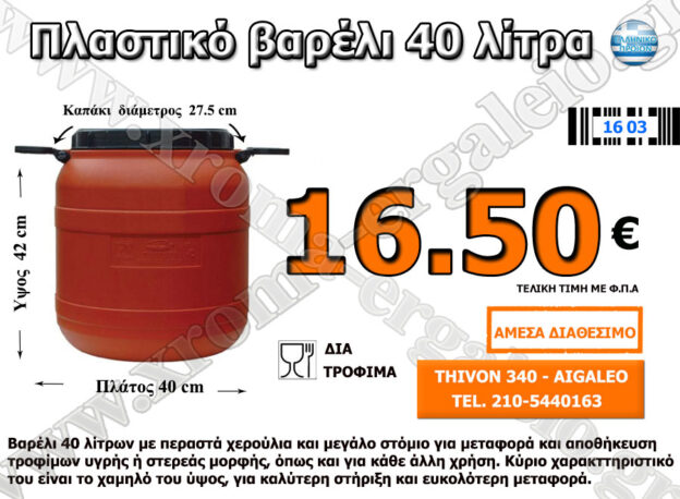 Πλαστικό Βαρέλι 40 λίτρα δια τρόφιμα από πολυαιθυλένιο υψηλής πυκνότητας (HD PE), για μεταφορά και αποθήκευση τροφίμων υγρής ή στερεάς μορφής, όπως και για κάθε άλλη χρήση. Πιό συγκεκριμένα μπορούμε να αποθηκεύσουμε λάδι , αλεύρι , τουρσί και για πολλές άλλες χρήσης.