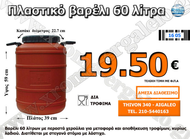 Πλαστικό Βαρέλι 60 λίτρα δια τρόφιμα από πολυαιθυλένιο υψηλής πυκνότητας (HD PE), για μεταφορά και αποθήκευση τροφίμων υγρής ή στερεάς μορφής, όπως και για κάθε άλλη χρήση. Πιό συγκεκριμένα μπορούμε να αποθηκεύσουμε λάδι , αλεύρι , τουρσί και για πολλές άλλες χρήσης.