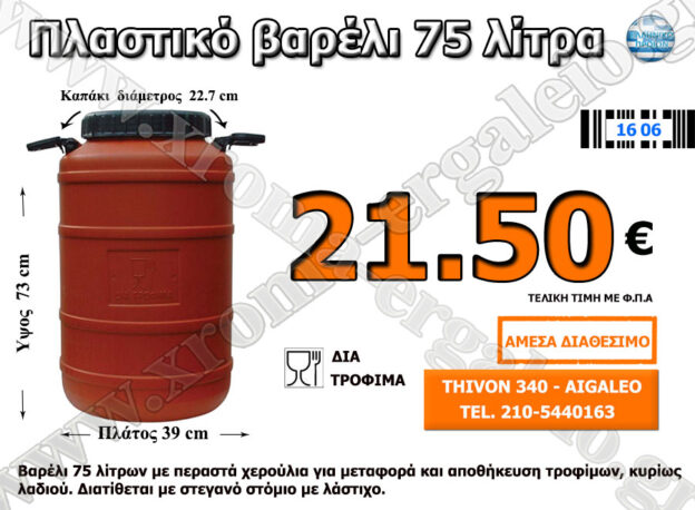 Πλαστικό Βαρέλι 75 λίτρα δια τρόφιμα από πολυαιθυλένιο υψηλής πυκνότητας (HD PE), για μεταφορά και αποθήκευση τροφίμων υγρής ή στερεάς μορφής, όπως και για κάθε άλλη χρήση. Πιό συγκεκριμένα μπορούμε να αποθηκεύσουμε λάδι , αλεύρι , τουρσί και για πολλές άλλες χρήσης.